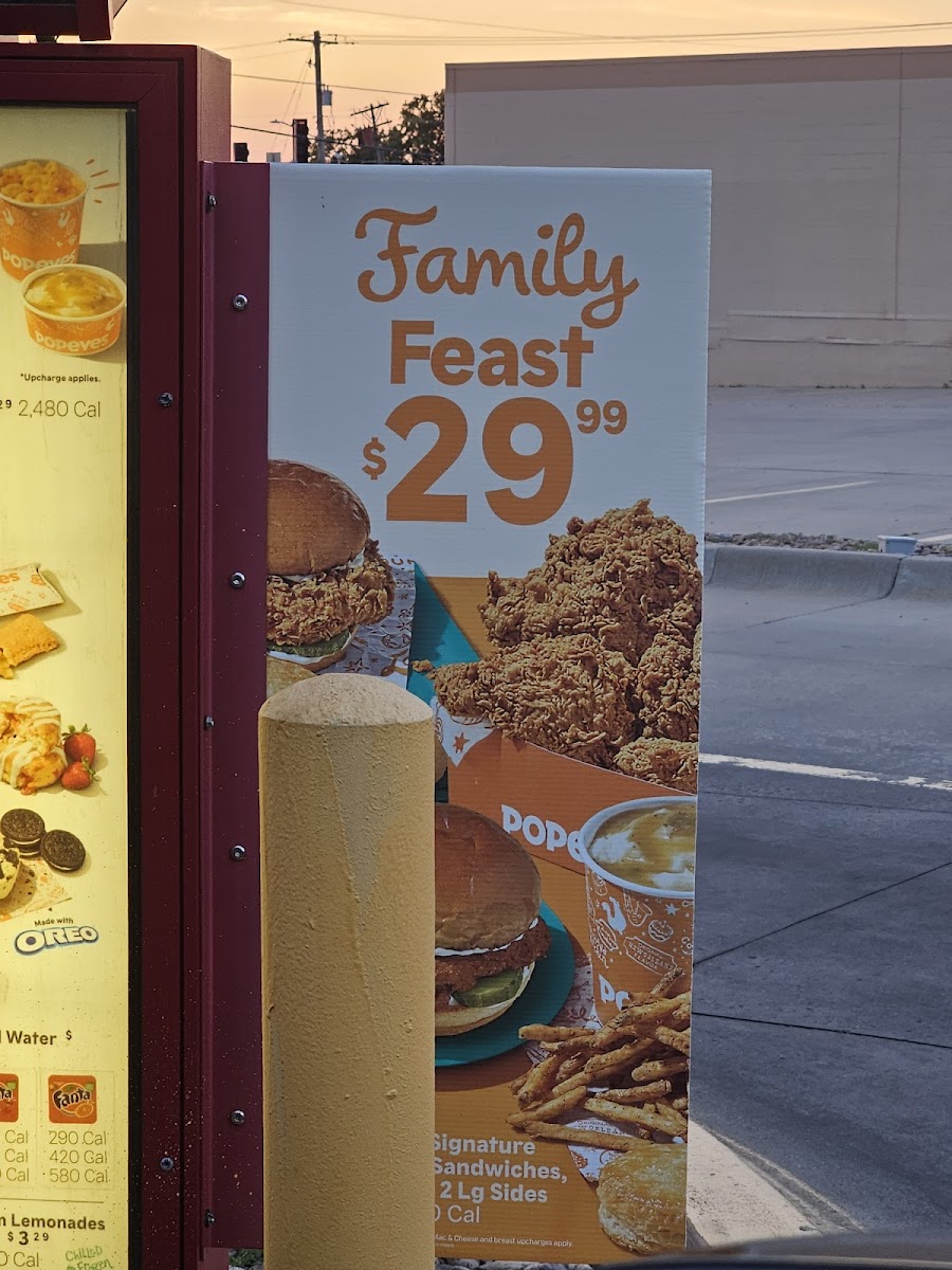 Two pieces of Popeyes' signature juicy, seasoned chicken with a side, buttermilk biscuit and a drink. Simple perfection.